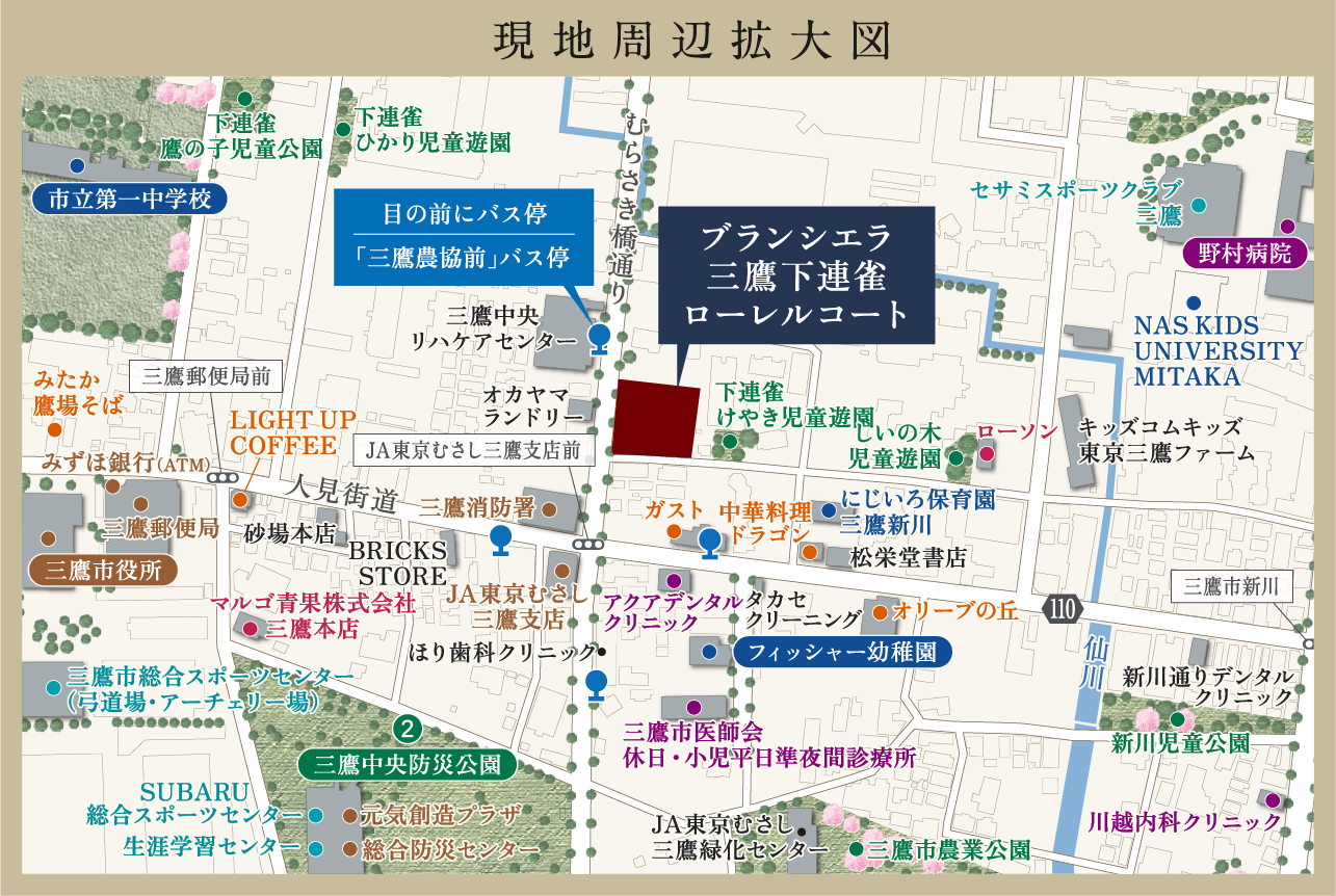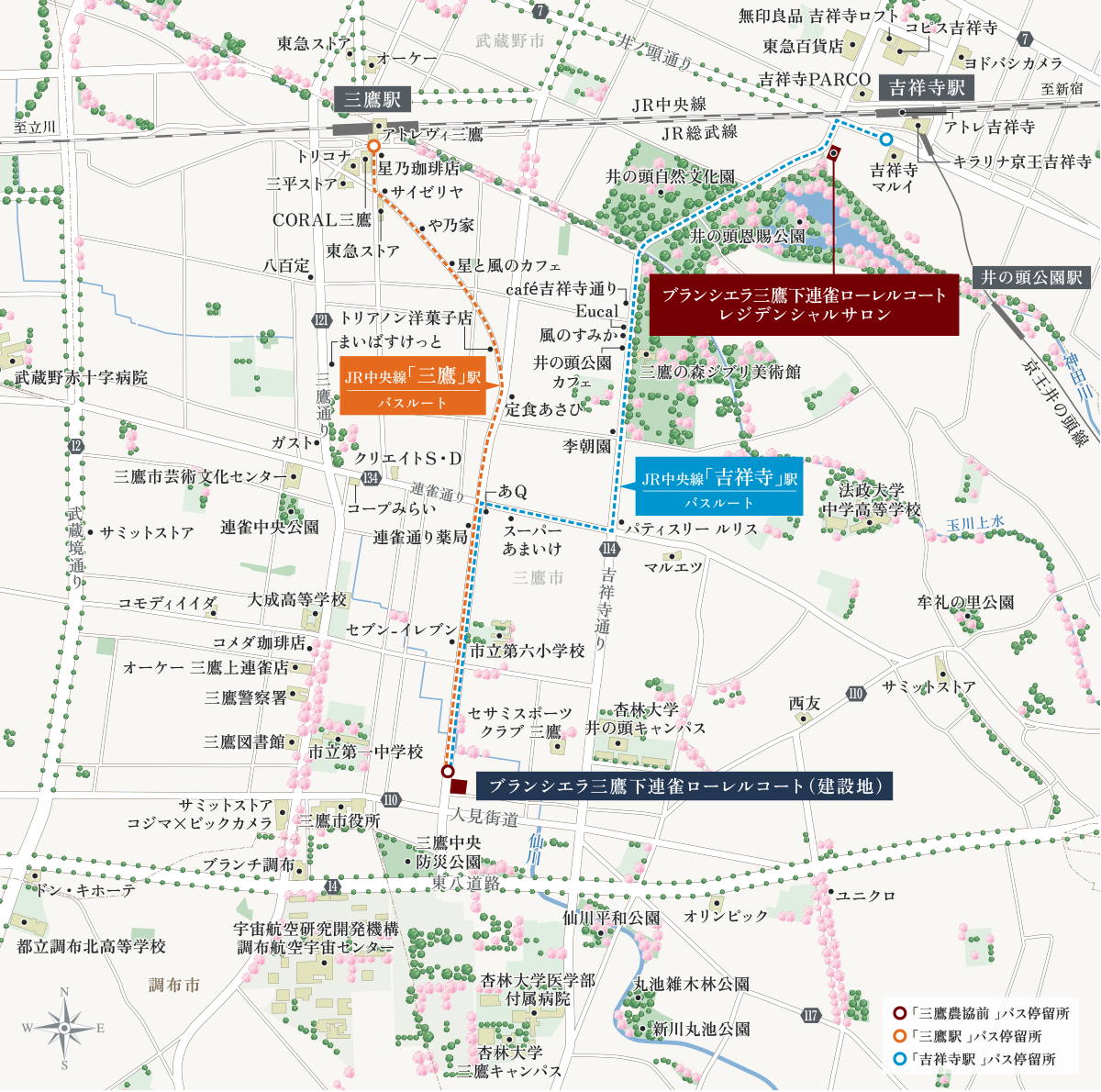 ※「三鷹」駅への自転車ルートはバスルートと同様、「吉祥寺」駅への自転車ルートはバスルートとは異なります。