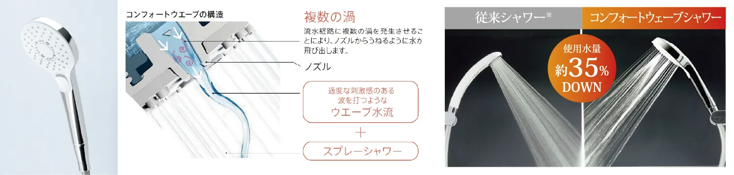 ウェーブ&スプレーシャワーの2つの水流により、軽快な刺激のある浴び心地を保ちながら、 しっかりと節水を実現。快適さはそのままに、現行の節水シャワー(毎分約8.5L)と比べて約24%、 従来の通常タイプ(毎分約10L)と比べて約35%もの節水効果があります。 クリックシャワーならこまめに止水することでさらに約48%の節水。