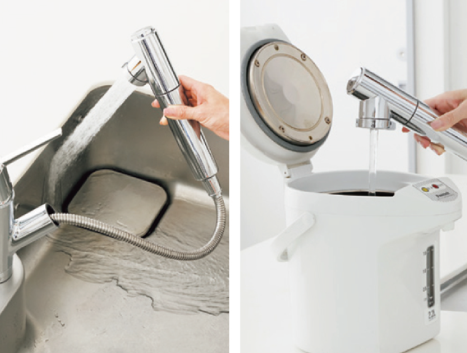 浄水器ごとホースが引き出せて浄水を注ぐ時やタンク洗いなどに便利です。