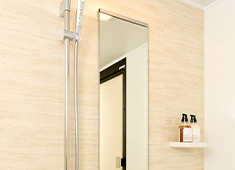シャワーの高さや角度を自由に調節できるスライドバーと便利なミラーを設置しました。