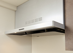 薄型のスタイリッシュなレンジフードは、整流板付きで煙や臭いをパワフルに吸い取ります。