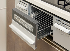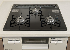 操作も簡単で使いやすいプッシュ式三口コンロを採用。天ぷら油過熱防止機能など、安全性にも配慮しています。
