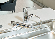浄水・原水、ストレート・シャワーの切り替えが簡単にできる浄水器一体型水栓。シンクの隅々まで洗えます。