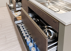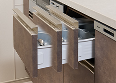 足元の巾木を引き出せばそのまま収納スペースに。空間を無駄なく使います。 ※食器洗い乾燥機下部を除く。