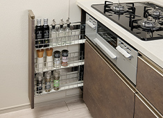 コンロ横のスペースを活かして調味料などの収納に便利なスペースを確保しています。