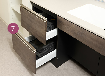 お客様からいただいたお声と、マンションの企画・設計・販売に携わる長谷工グループ女性社員の視点から「こうすればもっと使いやすいのに」「こんなスペースがあれば」など暮らしの中で感じている声を“気配り10ポイント”として形にした洗面化粧台「ドレッサーⅢ」を採用しました。