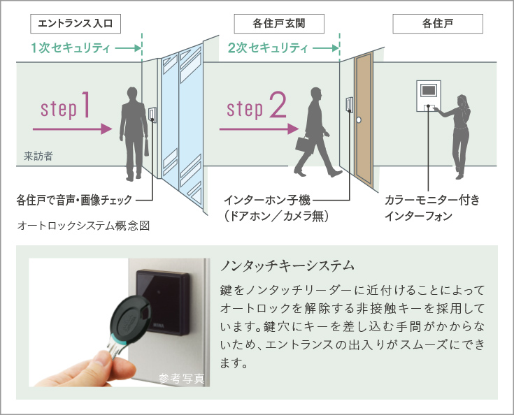 エントランスにはオートロックシステムを採用しました。来訪者を住戸内のカラーモニターで確認してからドアを解錠することで不審者などの出入りを抑止します。