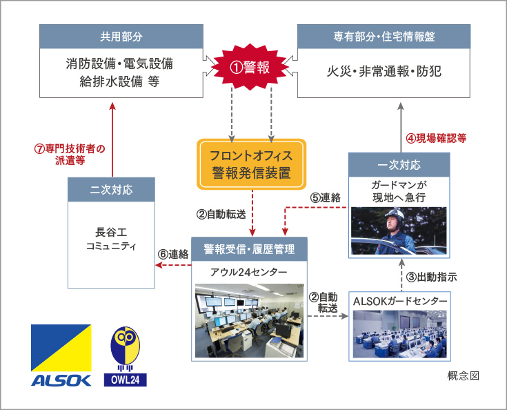 共用・専有部分のセキュリティ情報はアウル24センターが24時間365日体制で監視。ALSOKとの連携により、緊急時にはガードマンが出動する体制を整備しています。