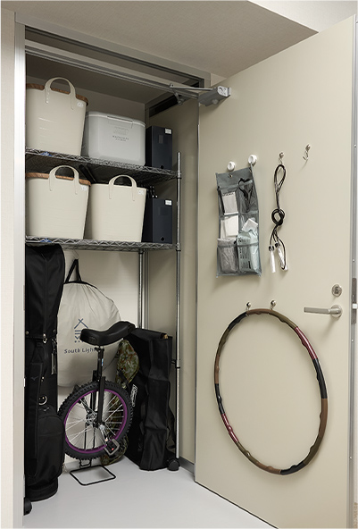 住戸の玄関前(一部住戸は1階共用部)にトランクルームをご用意しました。アウトドア・スポーツ用品などのかさばるもの、シーズンオフの家電などライフスタイルに合わせてご活用いただける便利な収納スペースです。※住戸によってトランクルームの形状、大きさは異なります。