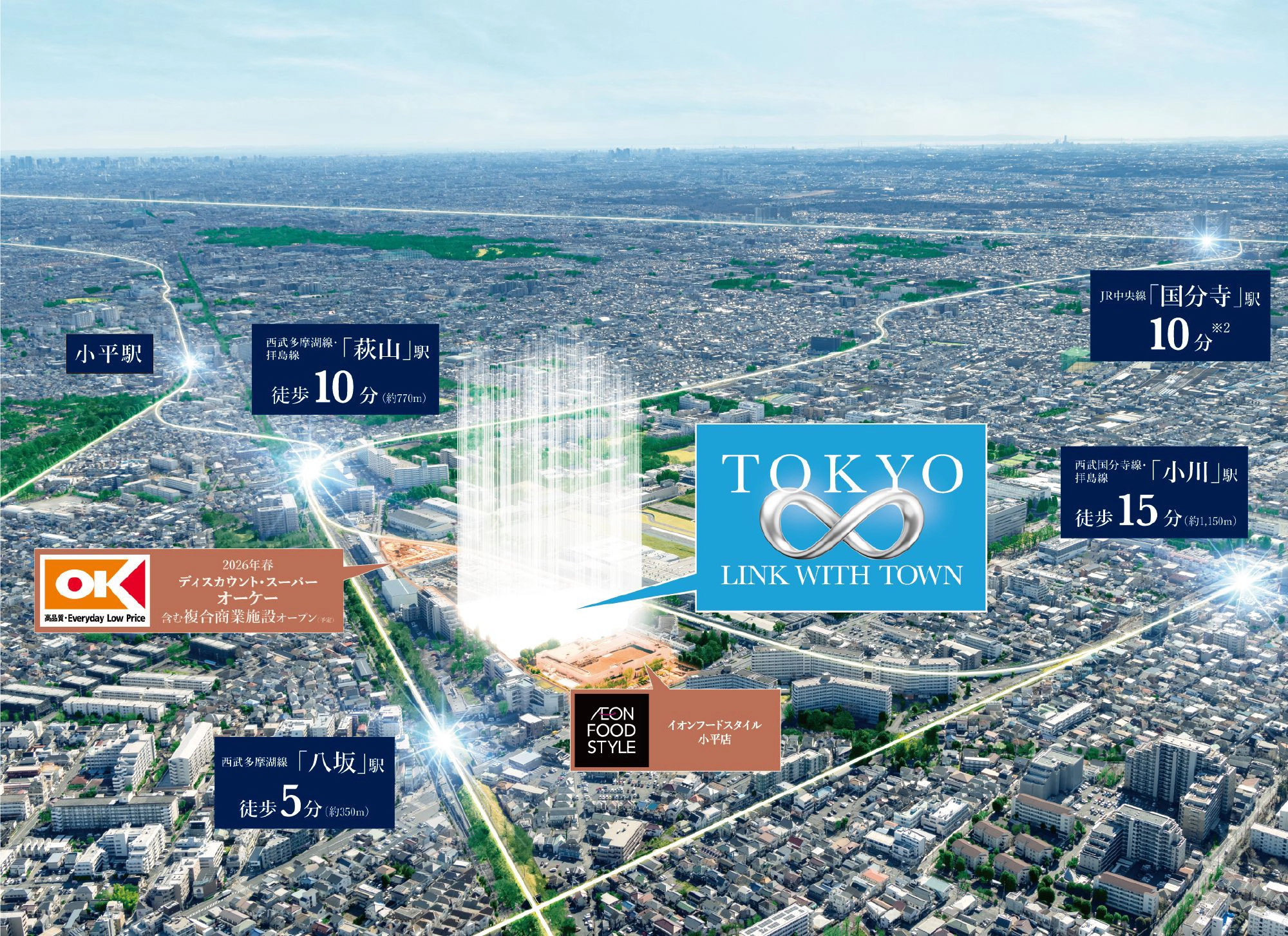 「イオンフードスタイル小平店」と、2026年春オープン予定の「ディスカウント・スーパー オーケー」含む複合商業施設。ふたつの賑わいに囲まれたこの街区は、最寄り駅から徒歩5分という利便性も備えた、街の進化を感じる暮らしの拠点へ。都市の再生が進むこの地に、くつろぎを中心に据えた、新しい住まいが誕生します。