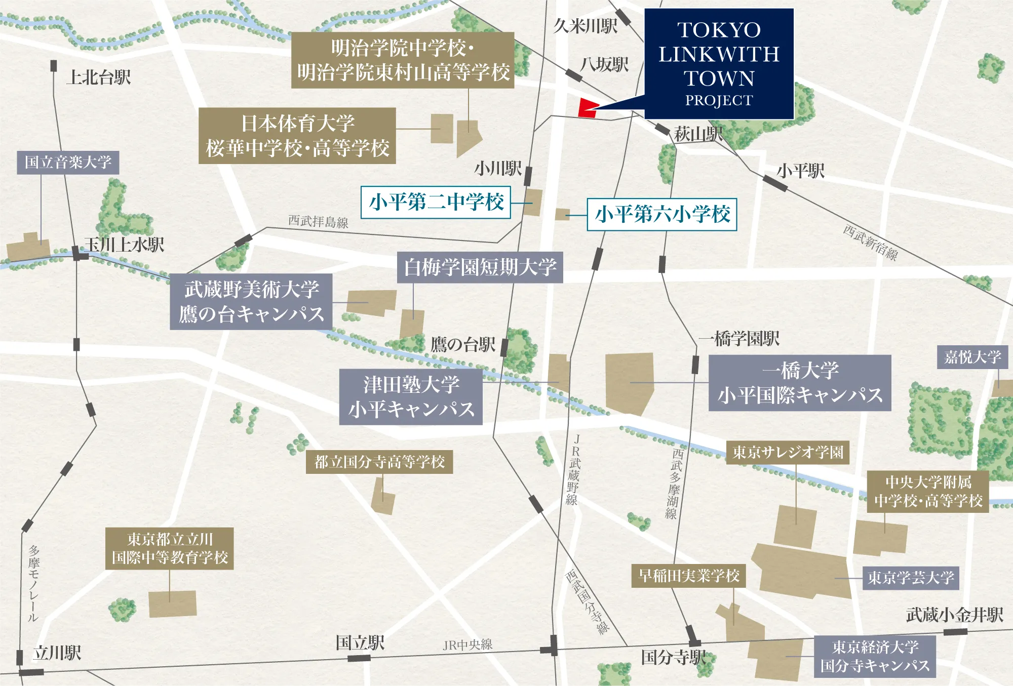 かつて陸軍通信学校があったこの地には、 現在「明治学院東村山高等学校」などの私立校が集まり、 静かな教育環境を形成。周辺には大学や小中学校も点在し、 知と人を育む、未来へ続く文教の地として歩みを重ねています。