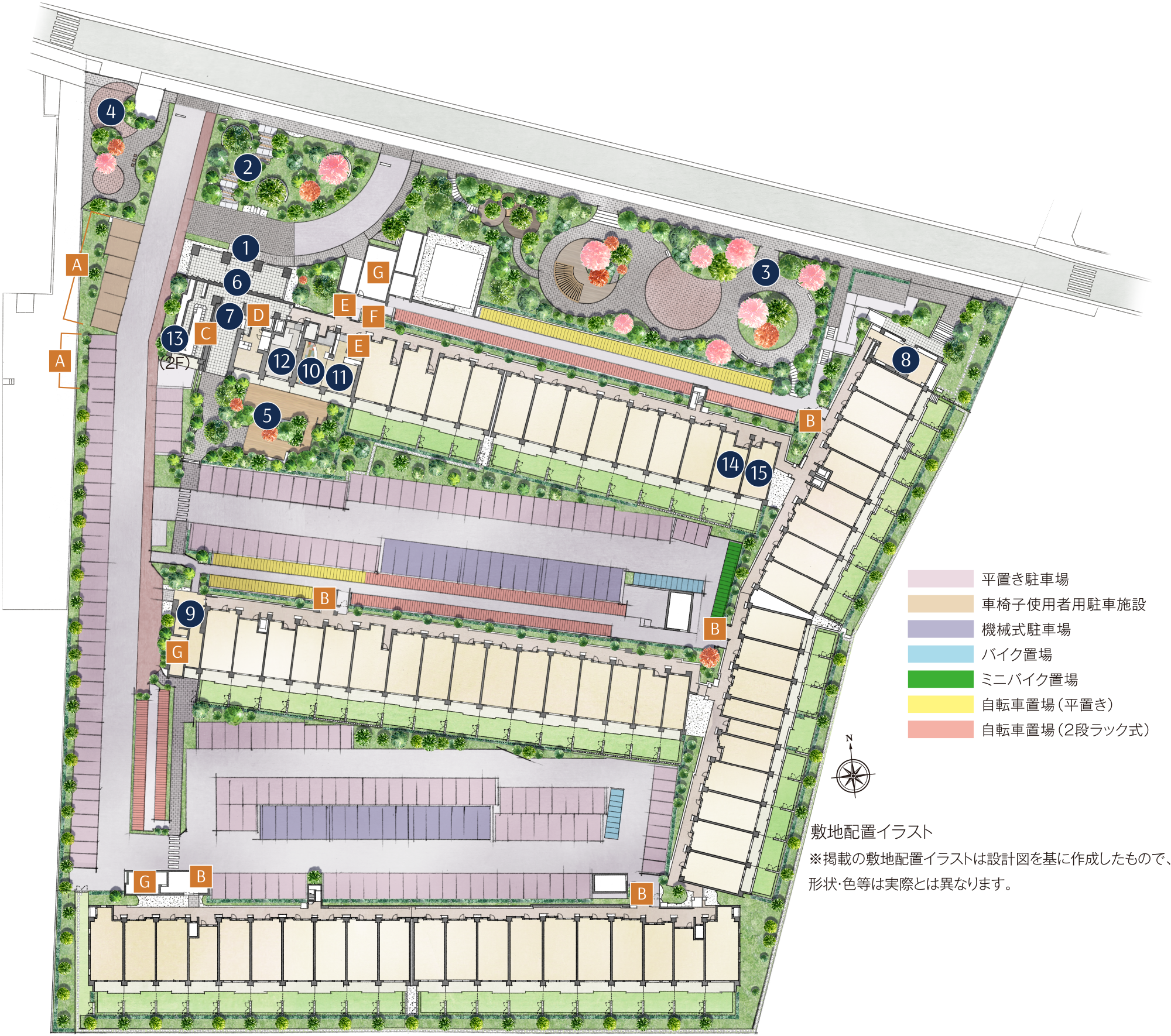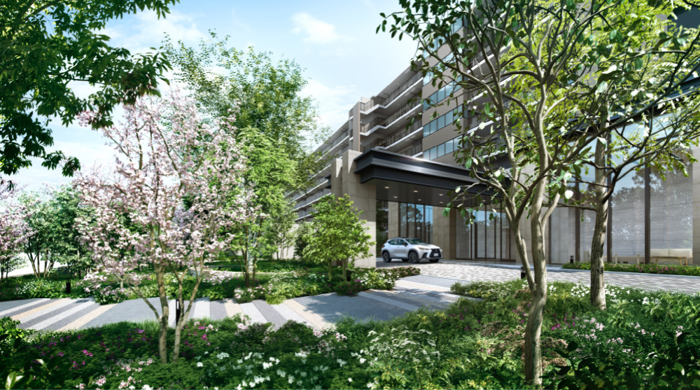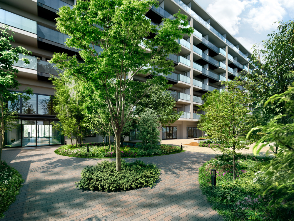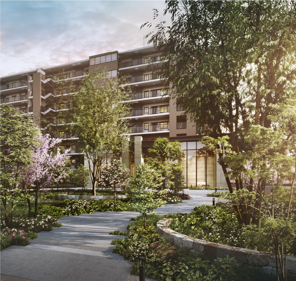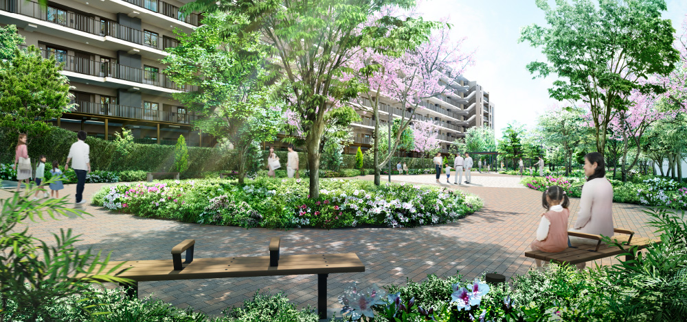 コミュニティに人々を招き入れる緑豊かなエントランスアプローチは、まるで公園内の森の小道を行くような季節感豊かな風景。桜などの四季折々の植栽に彩られた歩行者専用の小道は、一足ずつ移り変わる景色を眺めながら、我が家へと帰る心休まる演出です。