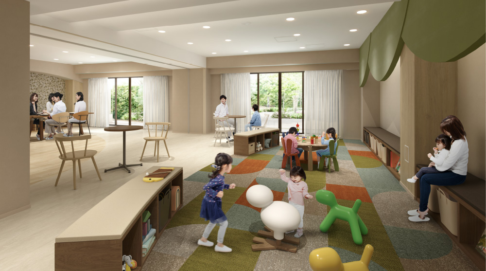 子供はのびのびと遊べて、保護者は見守りながら談笑できる安心設計。子育て世帯の交流が自然と生まれ、多世代で育ち合える空間です。