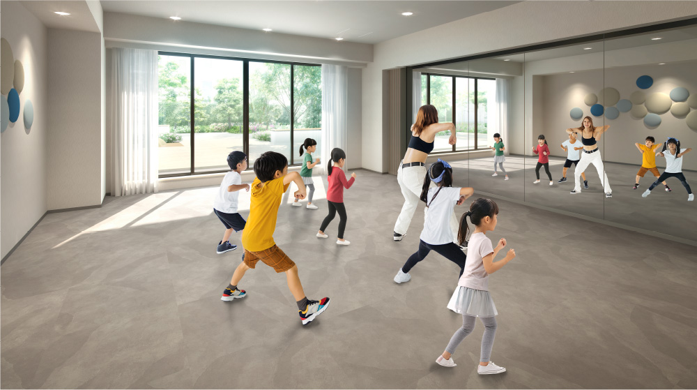 理事会の会議に使用するほか、机や椅子を畳めばヨガやダンス、習い事にも対応できる多目的空間。趣味や学びをシェアしながら、暮らしにひらめきを与える新しいコミュニティの拠点に。