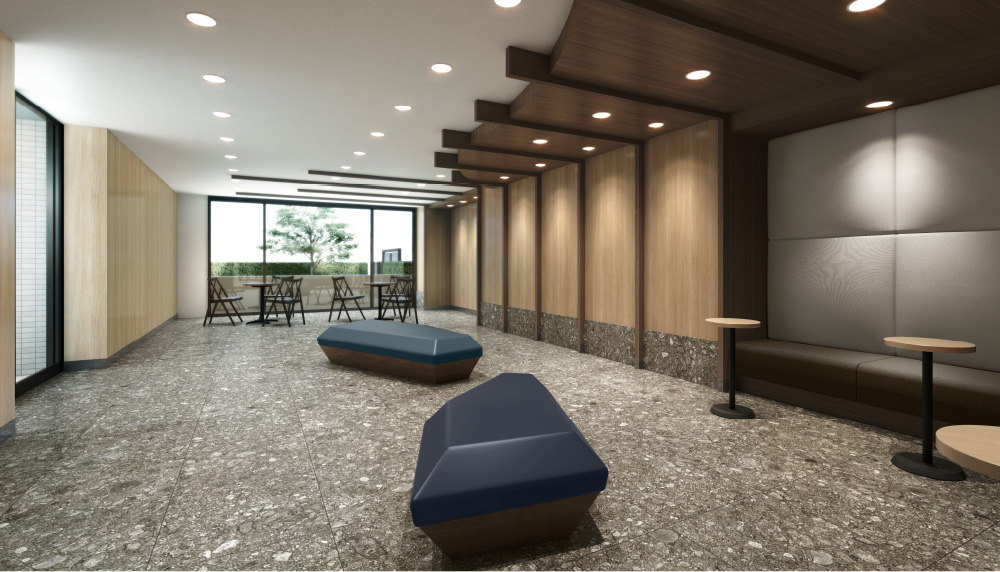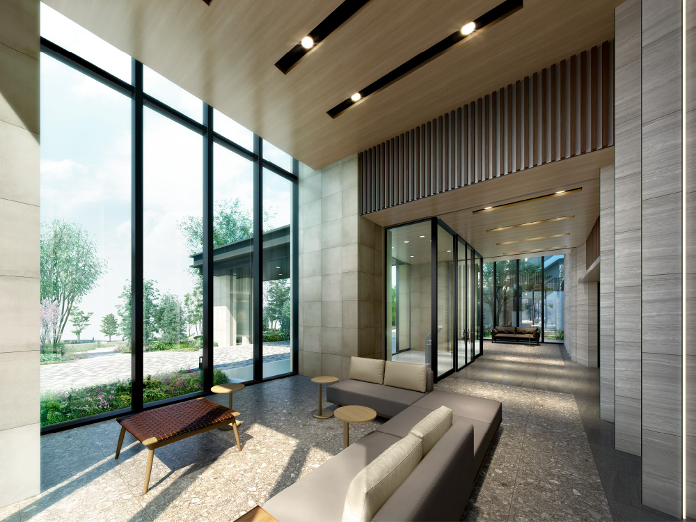 エントランスを入ってすぐに、左右に広がるふたつのラウンジ。吹き抜けの大きな窓から望む四季の緑が、石目調タイルの設えと調和し心安らぐ空間を演出。読書や待ち合わせなど思い思いの時間をお過ごしいただけます。住まう人や訪れる人の交流を育む、ホテルライクな迎賓空間です。