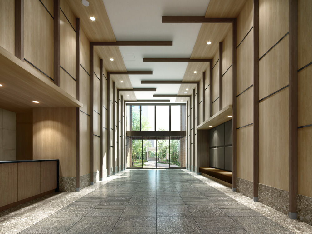 エントランスからラウンジを経て中庭へとつながる吹き抜けの大空間「エントランスホール」。正面の大きな窓から陽光が差し込む穏やかな空間で、木立の連続をイメージしたリズミカルで美しい装飾が、コミュニティの中へと誘います。