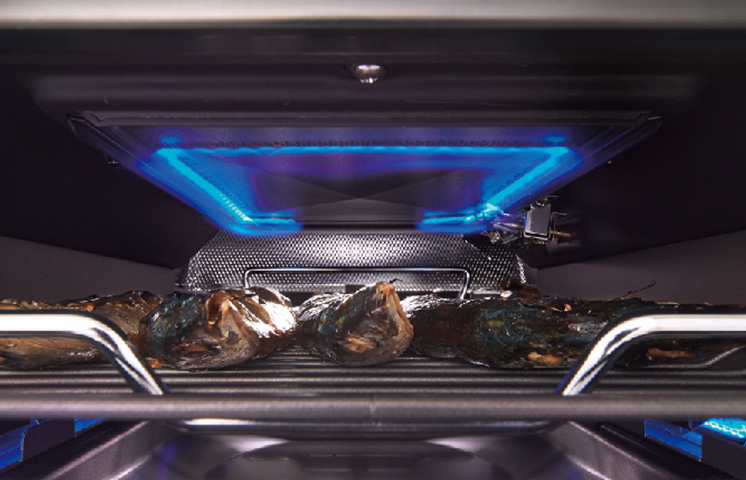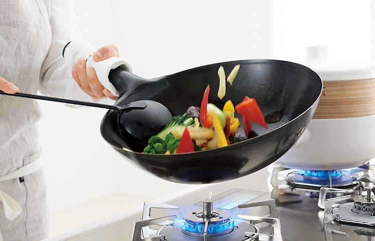 サッとひと拭き、お手入れが簡単なガスコンロ。左右どちらのバーナーでも高火力からトロ火まで自由自在。温度調節機能も搭載し、揚げ物や焼き物が便利に手早く調理できます。