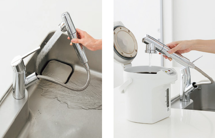 浄水器ごとホースが引き出せて浄水を注ぐ時やシンク洗いなどに便利です。