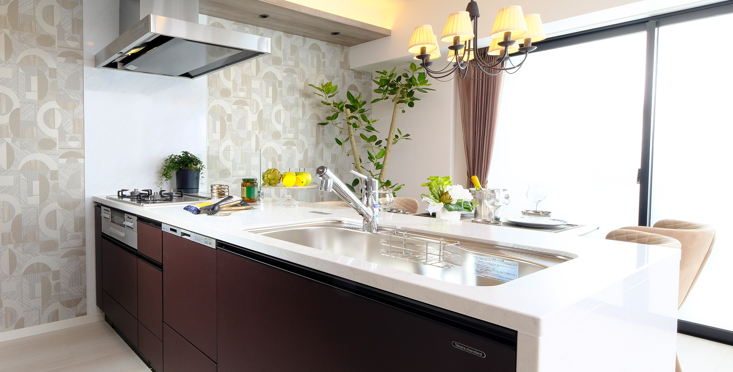 インテリア性に優れた人造大理石カウンターです。美しさが長持ちし、お手入れも簡単です。