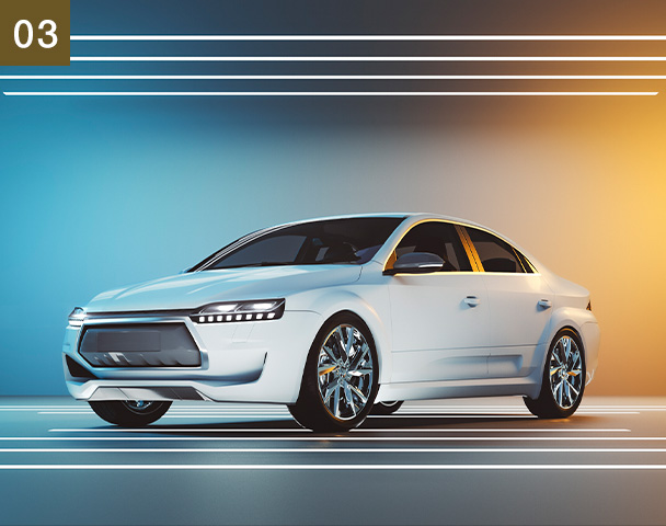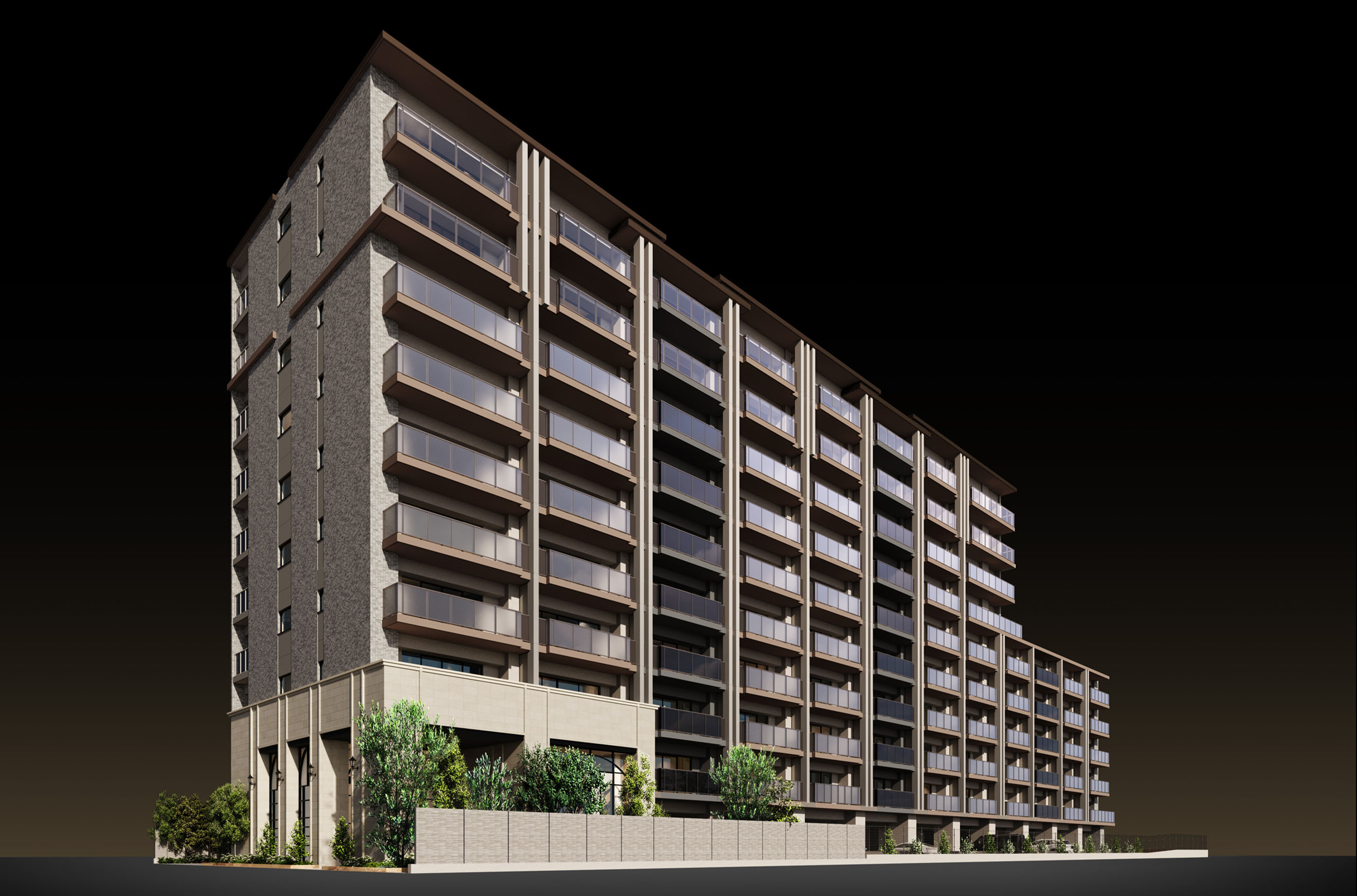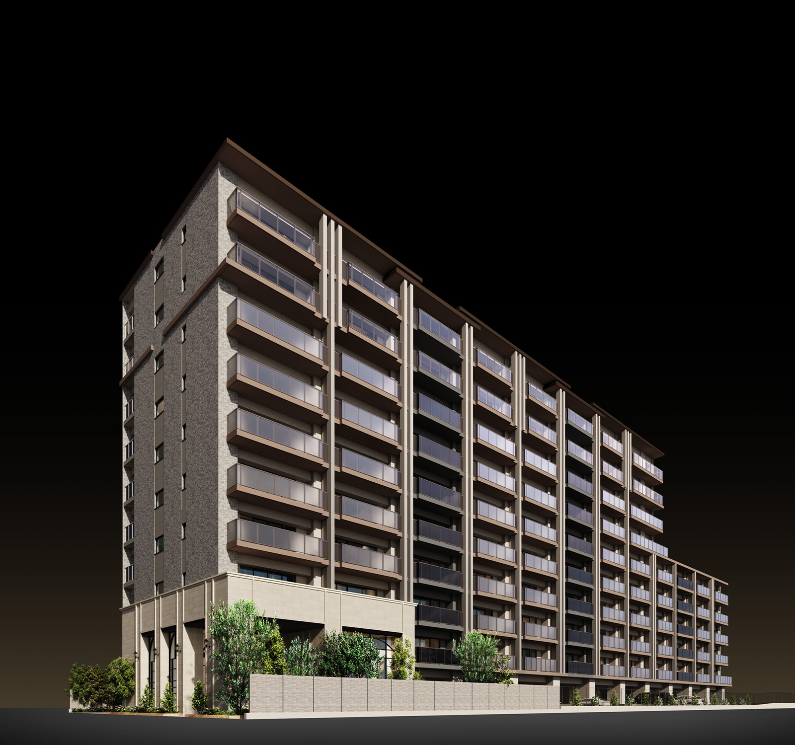 透明度の異なるバルコニーガラス手すりとともに邸宅感と軽快感が調和した表情を演出。