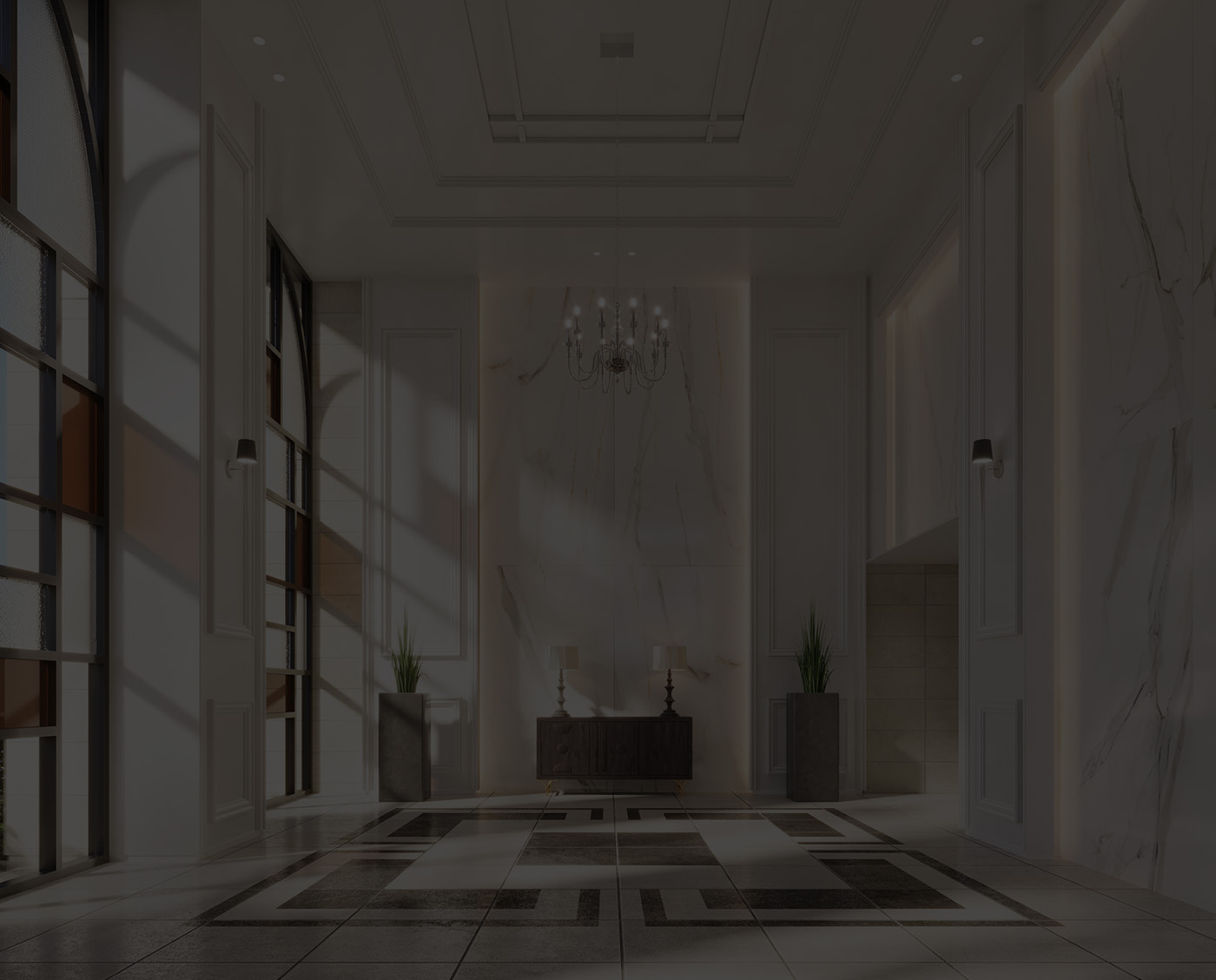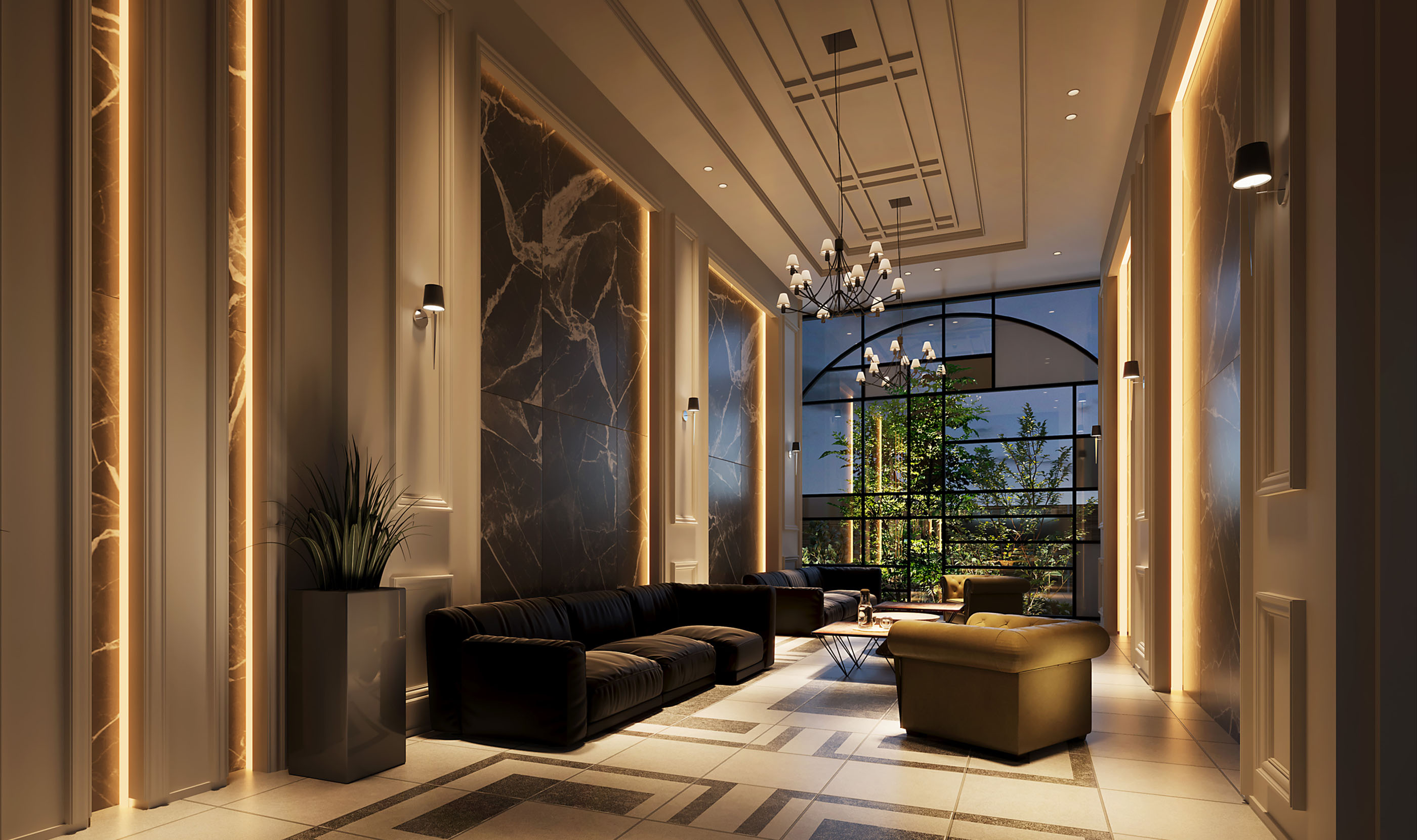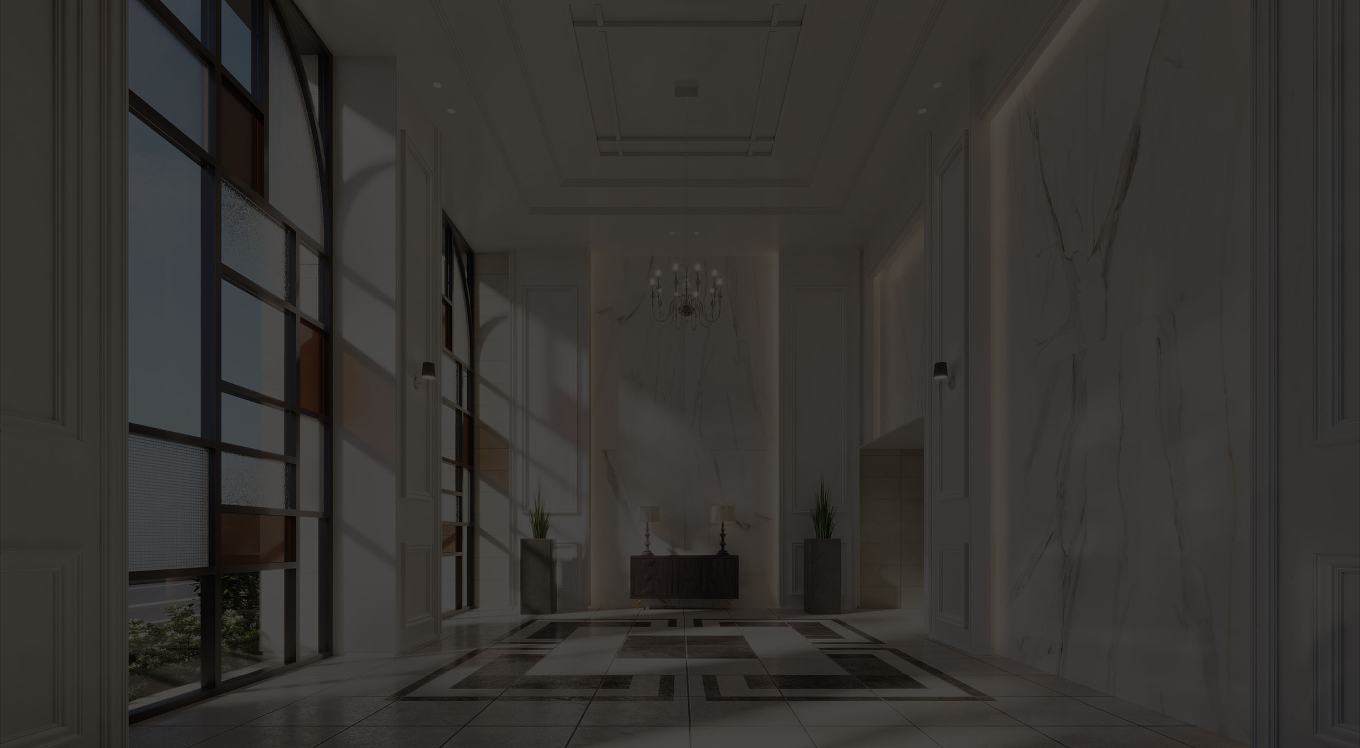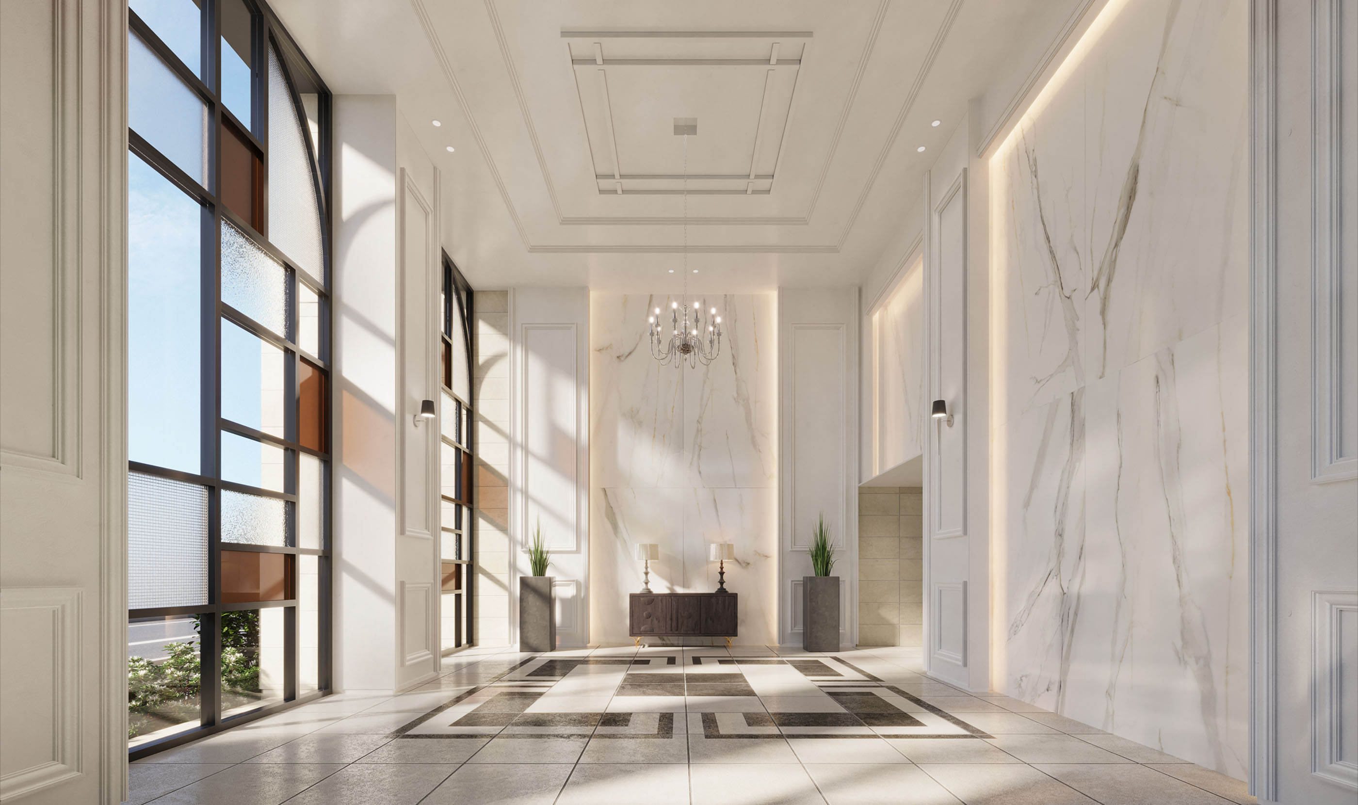 白基調の大理石をふんだんに用いた、光溢れる荘厳なエントランスホール。西洋の伝統的な建築物を想起させる美しさ際立つレジデンスです。