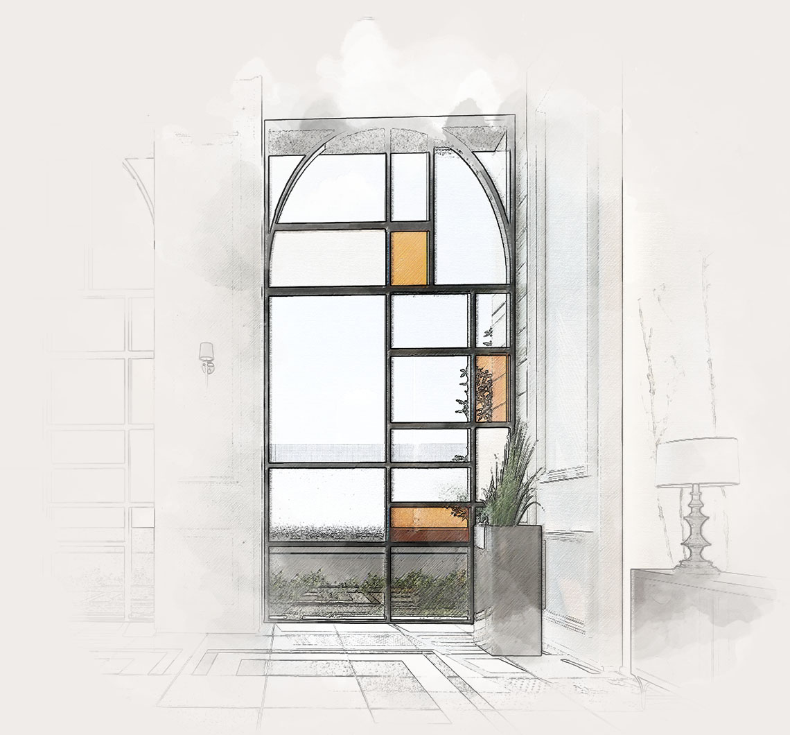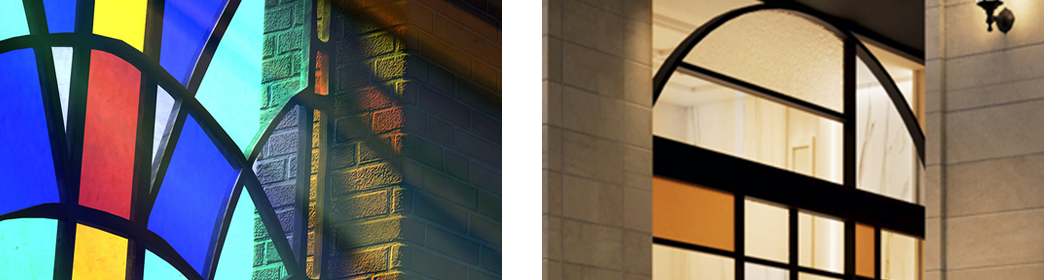 西洋との交流の歴史をイメージさせるステンドグラスを模した窓サッシを配し、異国情緒を醸すエントランスホール。光射す幻想的な空間に仕上げました。