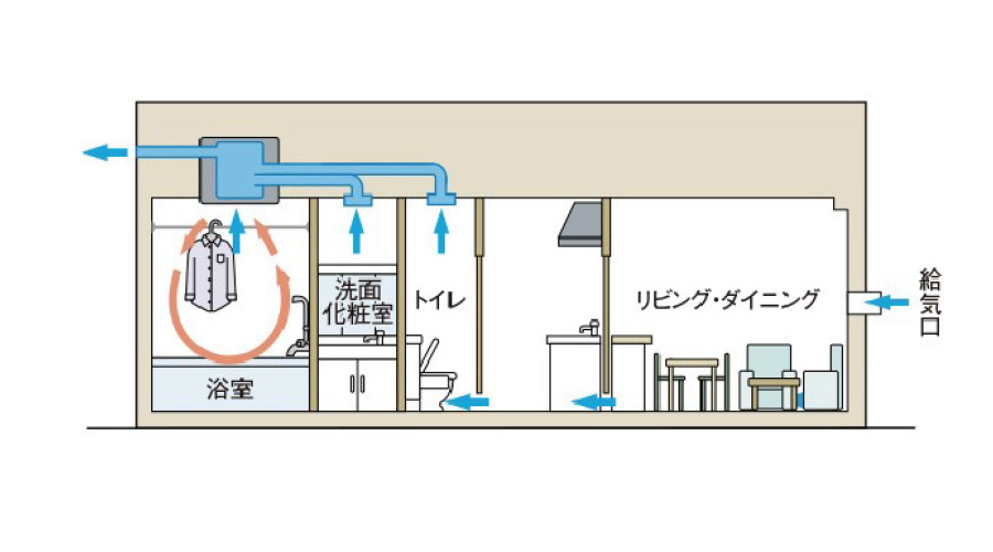 換気が可能に。浴室・洗面室・トイレの各換気口から汚れた空気を排出し、空気の循環で住戸内を快適に保ちます。
