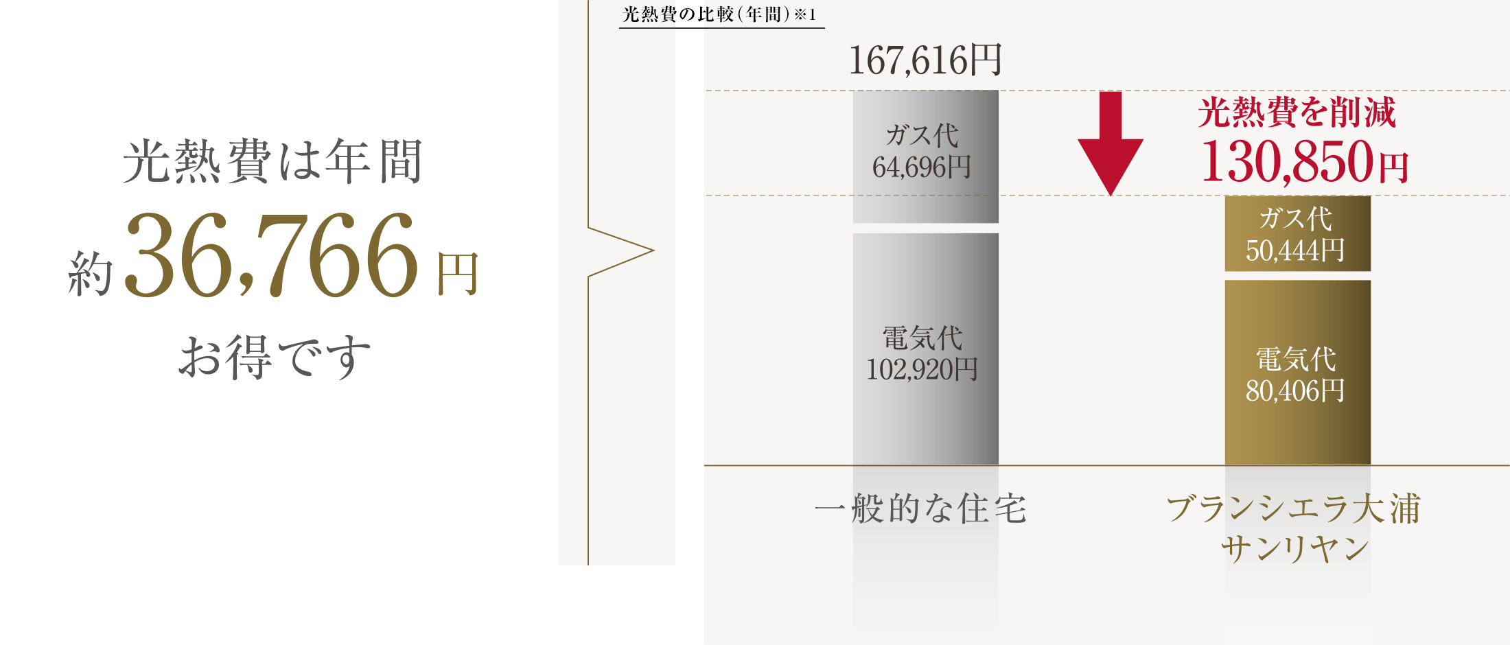 ※1:当該物件の年間光熱費は、国が定める基準(建築物エネルギー消費性能基準〈平成28年省エネルギー基準〉)に基づき、各設備の消費エネルギーを算出し、燃料単価を乗じて算出しました。そのため、本資料の年間光熱費は実際の年間光熱費を保証するものではありません。光熱費の数値は各住戸により異なります。