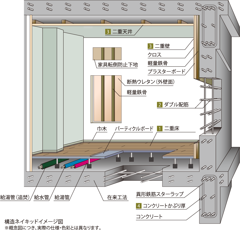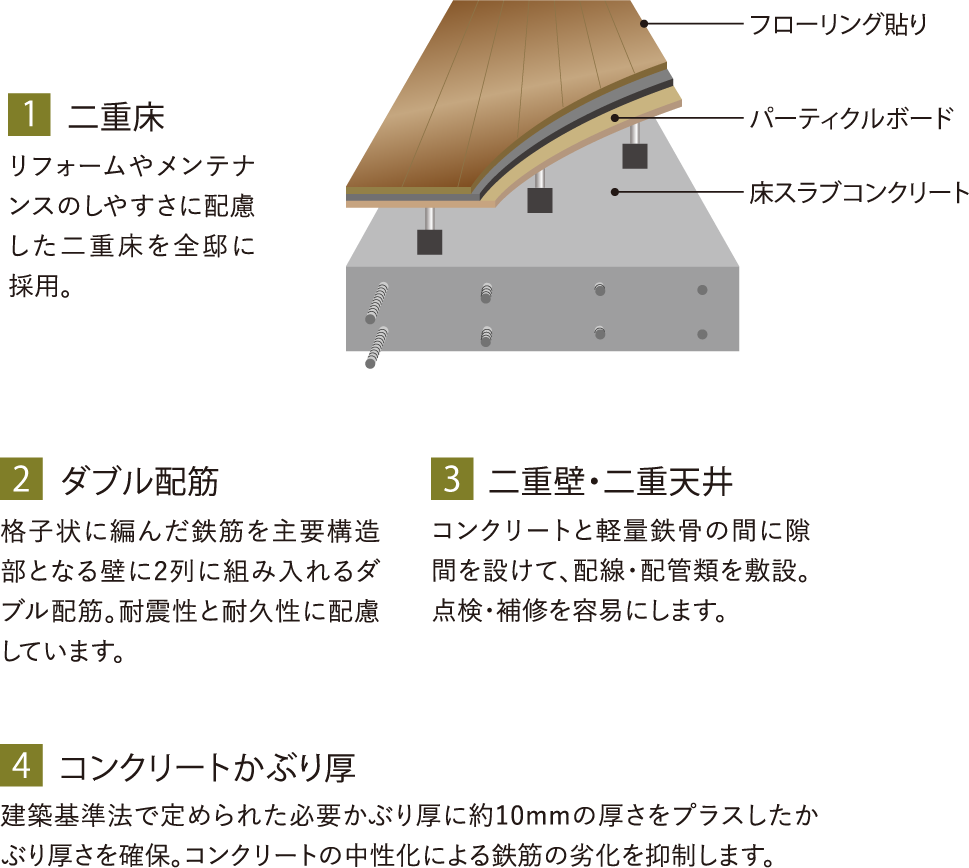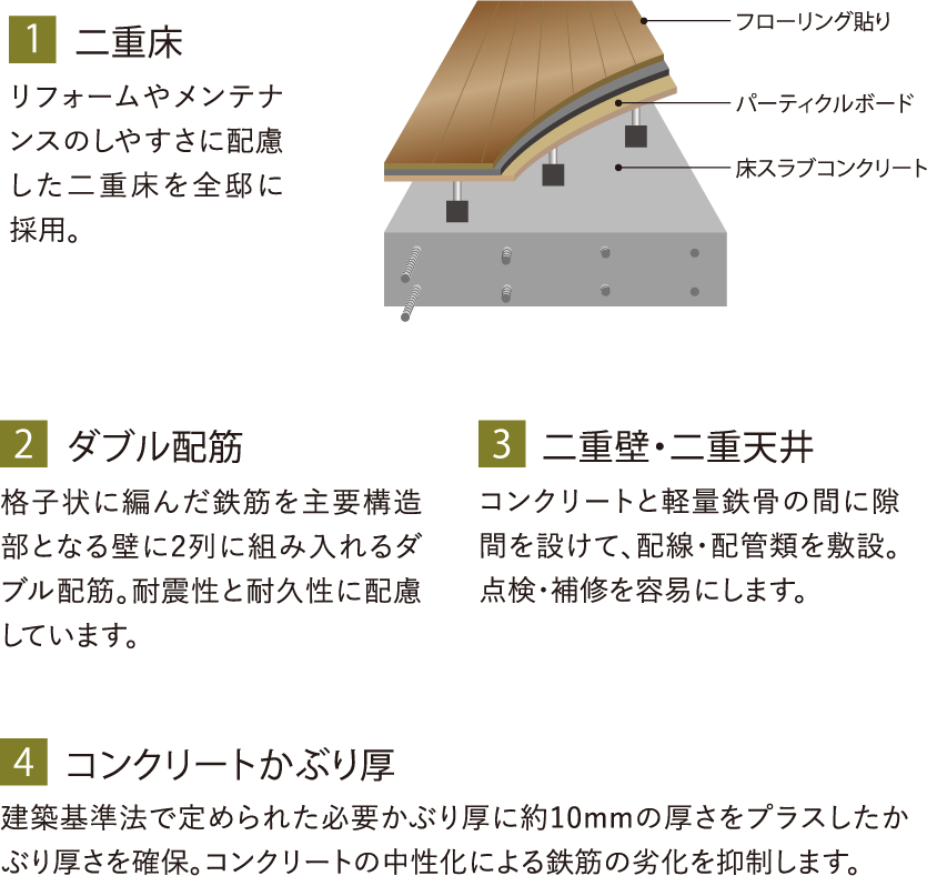 住まう安心を支える、確かな基礎と堅牢な構造。目に見えない部分にこそ確かな品質を採用。「安心」と「快適性」を徹底的に追求した揺るぎない基本性能が建物を守ります。