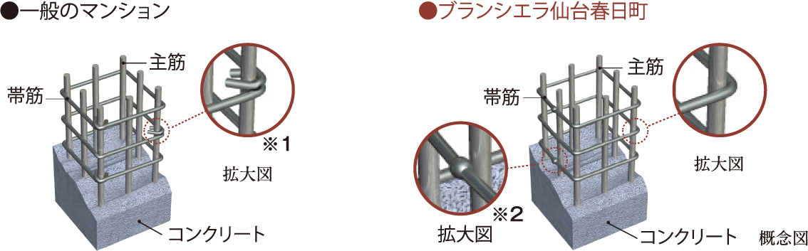 主要構造部のコンクリート柱には、工場であらかじめ溶接された溶接閉鎖形帯筋を採用しています。一般的な帯筋を用いた場合に比べ、より粘り強さのある構造となります。(基礎部及び仕口部を除く)