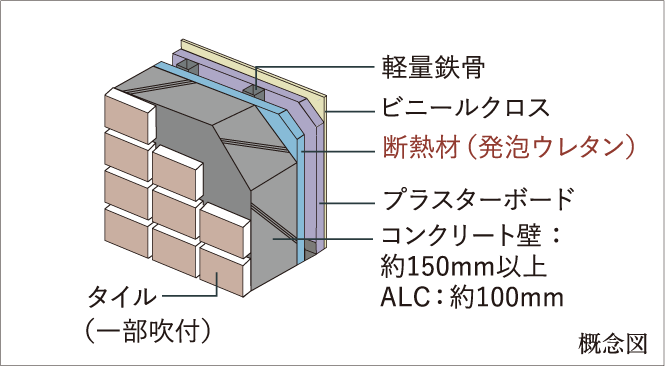 外部に面した壁・梁・柱の室内側には25mm以上の断熱材を吹付けし、プラスターボード貼りとしています。(一部除く)