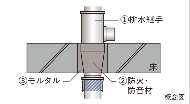 住戸内の排水立て管には、遮音シートを設置した硬質塩化ビニル管を採用。また直接居室に面したパイプスペースの排水立て管の床貫通部には防火防音措置工法を施し、遮音効果を高めます。