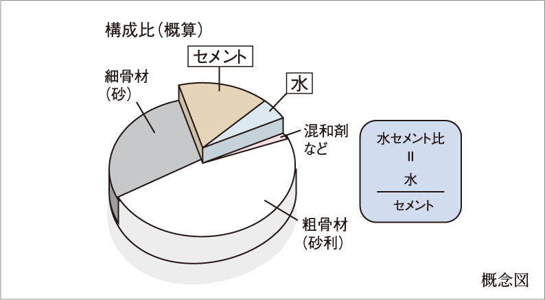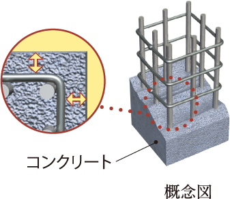 主要構造部のコンクリートは、水、セメント、骨材等で構成されています。このとき、セメントに対する水の比率(水セメント比)を抑えるほど、耐久性を高め、劣化を抑えることができます。当マンションのコンクリートは、この水セメント比を、住棟の上部構造は50%以下に設定しています。(付属施設、外構等を除く)