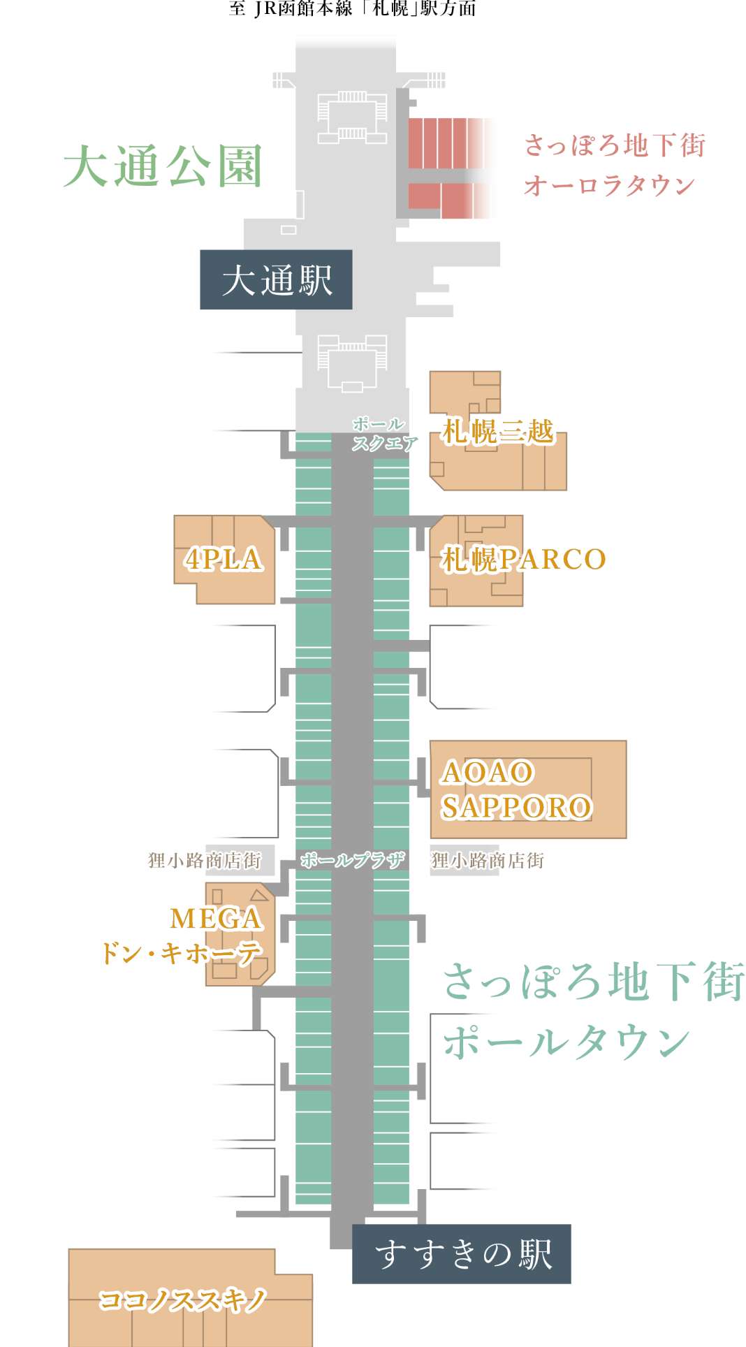 「大通」駅と「すすきの」駅をつなぐ全長約400mの地下街には、様々なジャンルの店舗が入る他、札幌三越や札幌PARCOなどに直結しています。