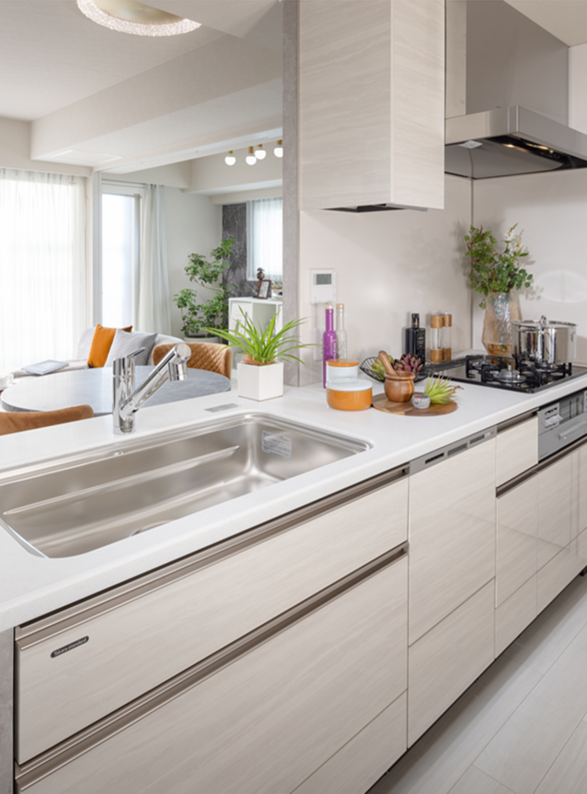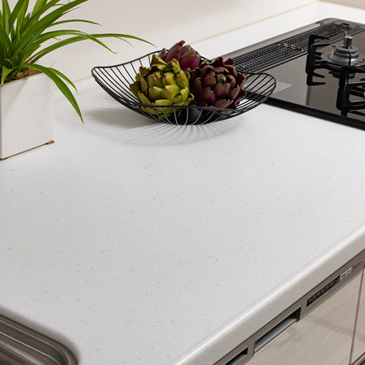システムキッチンの天板には見た目も美しく高級感にあふれ、お手入れもしやすい人工大理石のワイドカウンターを採用しています。