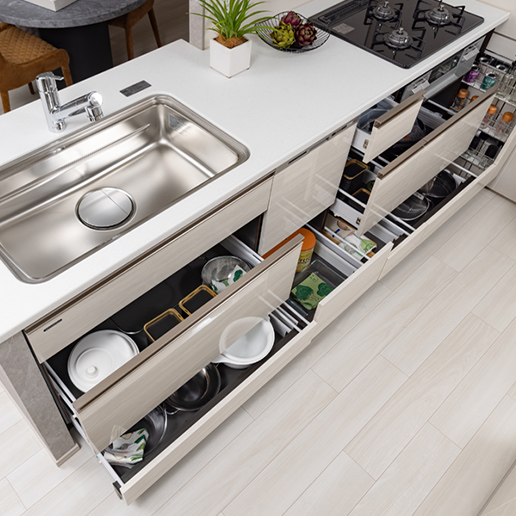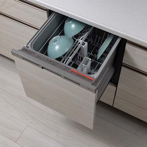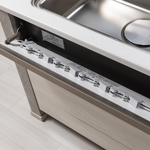家事負担を軽減する食器洗い乾燥機を標準装備しました。スライド式で食器の出し入れもスムーズです。