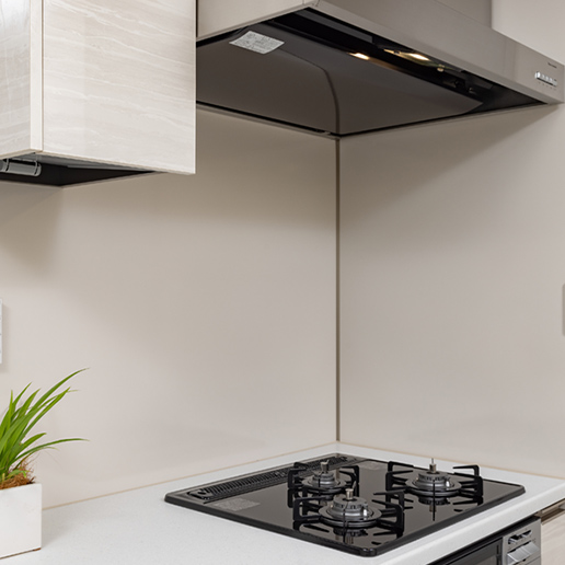 スタイリッシュなレンジフードを採用。整流板がホーロー製の為、油汚れも簡単に拭き取れます。
