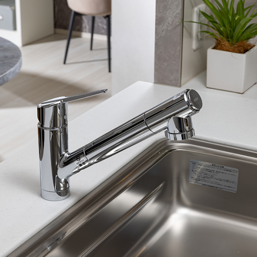 キッチン水栓には、浄水・節湯機能付混合水栓を採用。操作が簡単で、省エネでご利用いただけるシングルレバータイプです。