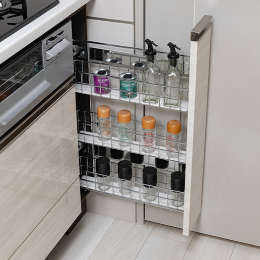 コンロ横のスペースを活かして調味料などの収納に便利なスペースを確保しています。