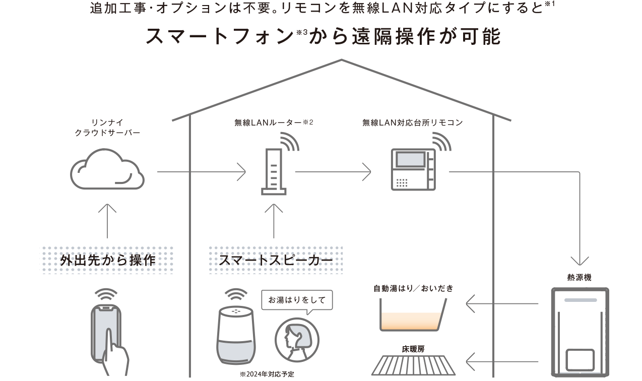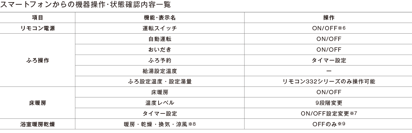 ※1 対応する給湯器が必要です。 ※2 家庭用無線LANルーターをご使用ください。モバイルルーター(ポケットWi-Fi)、テザリングでの使用はできません。また無線LANに接続可能な環境下に限ります。詳しくは弊社窓口へお問い合わせください。 ※3 スマートフォンはiPhone、Androidに対応。iPhoneは、Apple Inc.の登録商標です。Androidは、Google Inc.の登録商標または商標です。 ※4 Googleアシスタントを搭載する各社スマートスピーカーで利用可。 ※5 Amazon Echo等のAlexa搭載デバイスで操作が可能。Google、Googleアシスタント、Google HomeはGoogle LCCの商標です。 ※6 給湯温度が50℃以上の高温設定になっている場合や、出湯中の場合は操作不可。 ※7 床暖房のタイマー設定については、給湯リモコンで操作するお部屋の床暖房のみアプリで変更可能。床暖房専用リモコンで操作するお部屋の床暖房はアプリでタイマー設定変更不可(ON・OFF・温度レベルのみ可)。 ※8 2室暖房のRBH-C3301Wシリーズは暖房運転のみ。 ※9 リモコン332シリーズと浴室暖房乾燥機RBH-C4101・C3301・C3301W・W415シリーズと熱源機RUFH-ME・UE・UME・E2408・E2407・SE・RVD-UE・E・RUFH-Aシリーズの組み合わせの場合は、OFF以外も操作可能です。