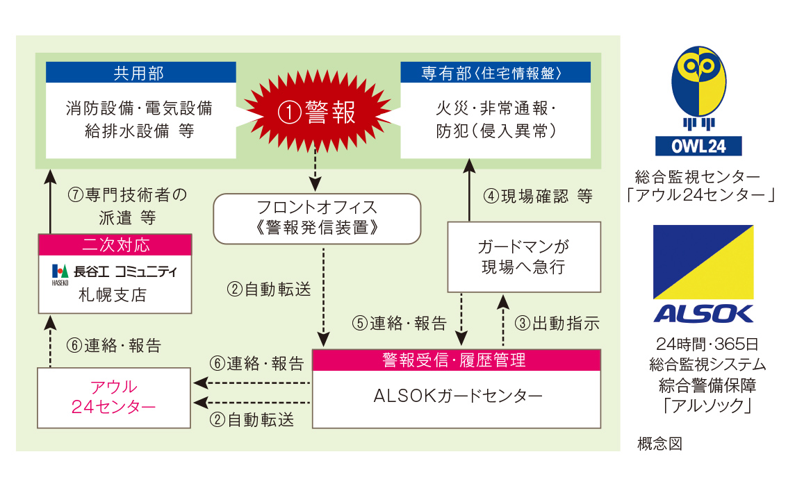 単にマンションの共用部だけを管理するのではなく、専有部のさまざまな警報・通報を24時間365日体制で監視します。