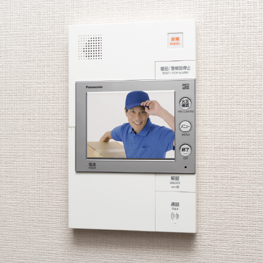 エントランスの来訪者をインターホンの通話とカラー映像で確認でき、録画機能も備えています。また、住戸内の異常発生や宅配の通知をモニターに表示しお知らせします。
