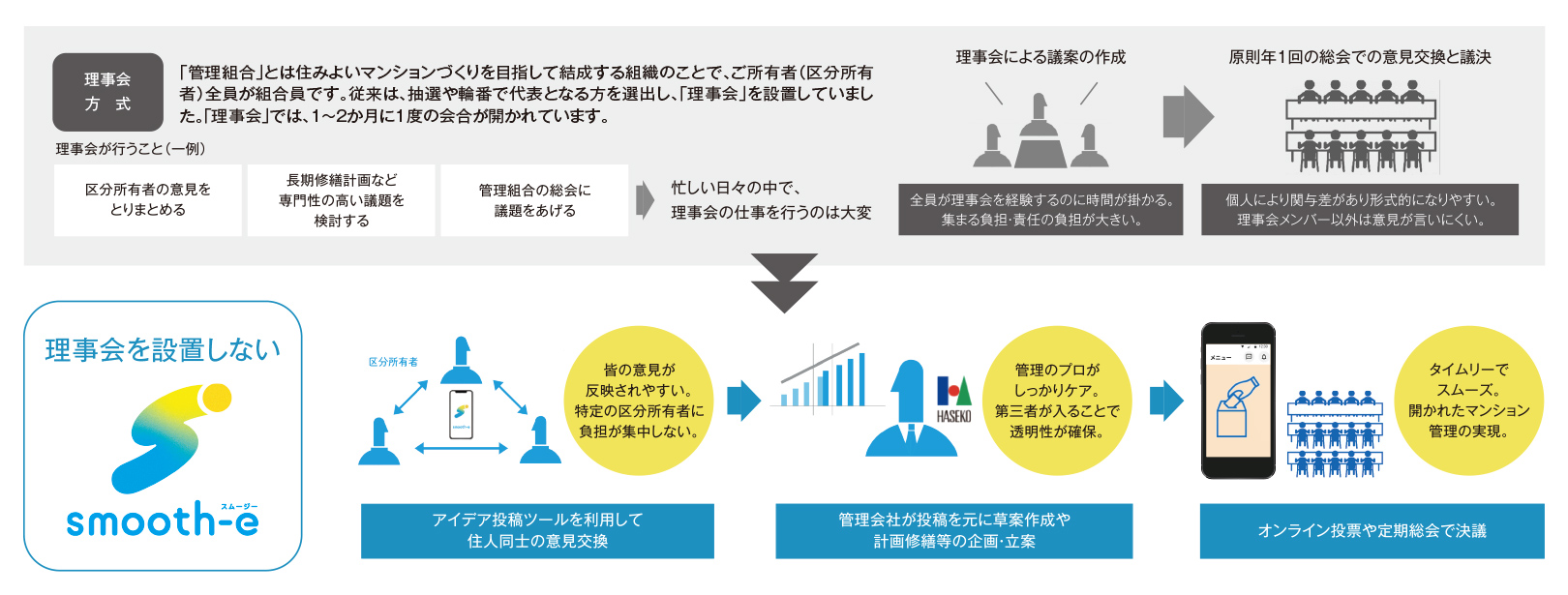 本計画では、管理システムにおいても利便性の向上を追求。マンションご所有者の声から生まれた新しいマンション管理サービス「smooth-e」(スムージー)を導入しました。