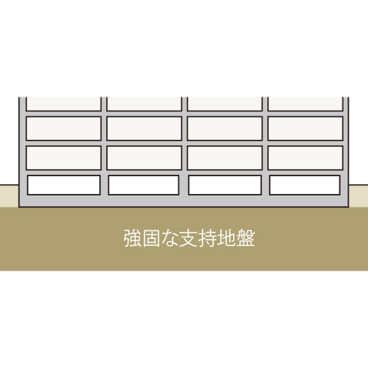 地表約3.75m~4.53mの強固な支持地盤の上にセメント等を混ぜた撹拌土で地盤の改良を行い、その上部に建物を建てています。