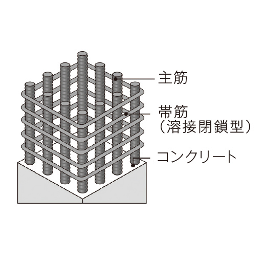 溶接閉鎖型のせん断補強筋を採用しています。これは工場で特殊溶接をして閉じた形にした帯筋のことで、コンクリートを拘束する能力が高く地震時の粘り強さに優れています。※一部除く