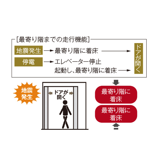 最寄り階に停止させてドアが開き、閉じ込めを回避します。また、停電時にも無事に最寄り階に止まる停電時自動着床装震も設置しています。