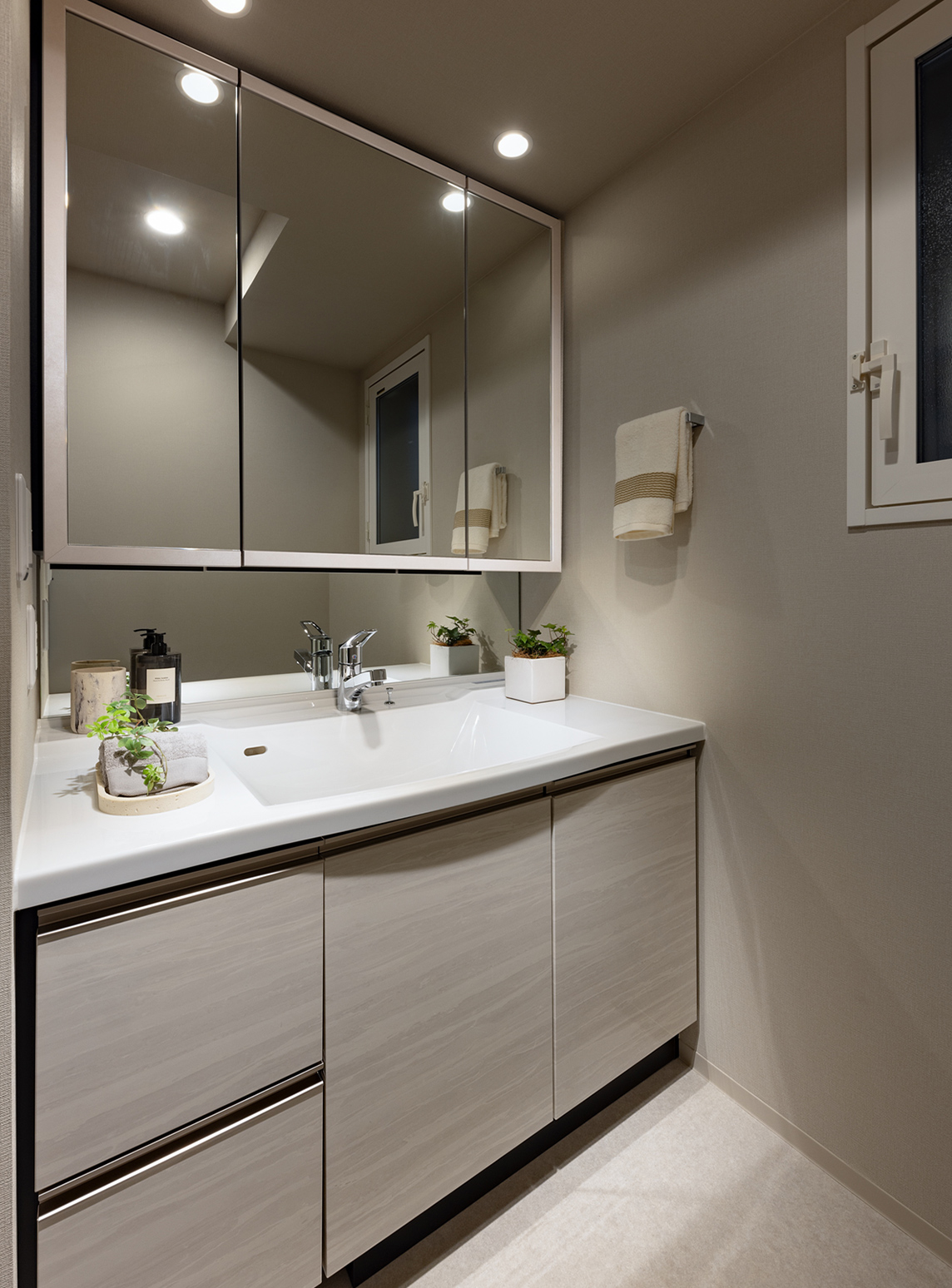 インテリアとしての見た目にもこだわり、三面鏡の四方に框をデザインしました。