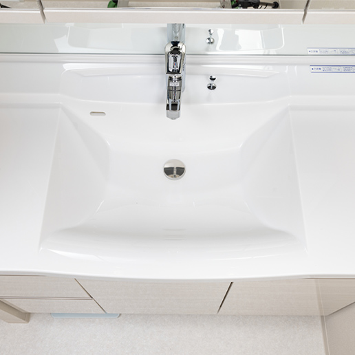 天板とボウルの継ぎ目がない一体型カウンタートップ。スクエアなボウル形状と艶有り人造大理石天板が、高級感を演出します。