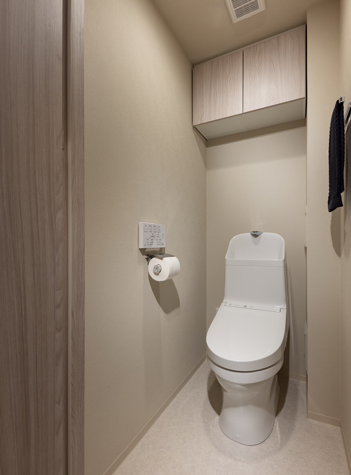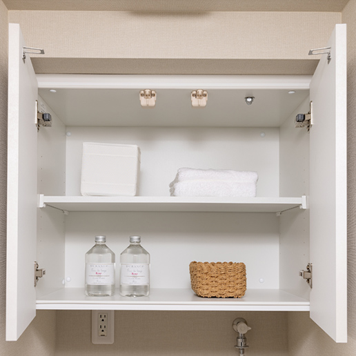 トイレの上部にトイレットペーパーなどの収納に便利な吊戸棚をご用意しています。