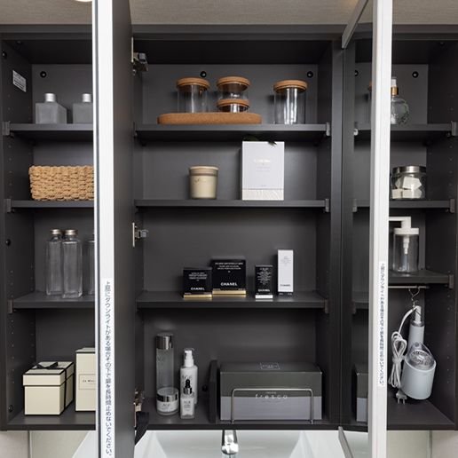 扉背面に収納スペースを設けた三面鏡です。小物をすっきりと収納することができます。
